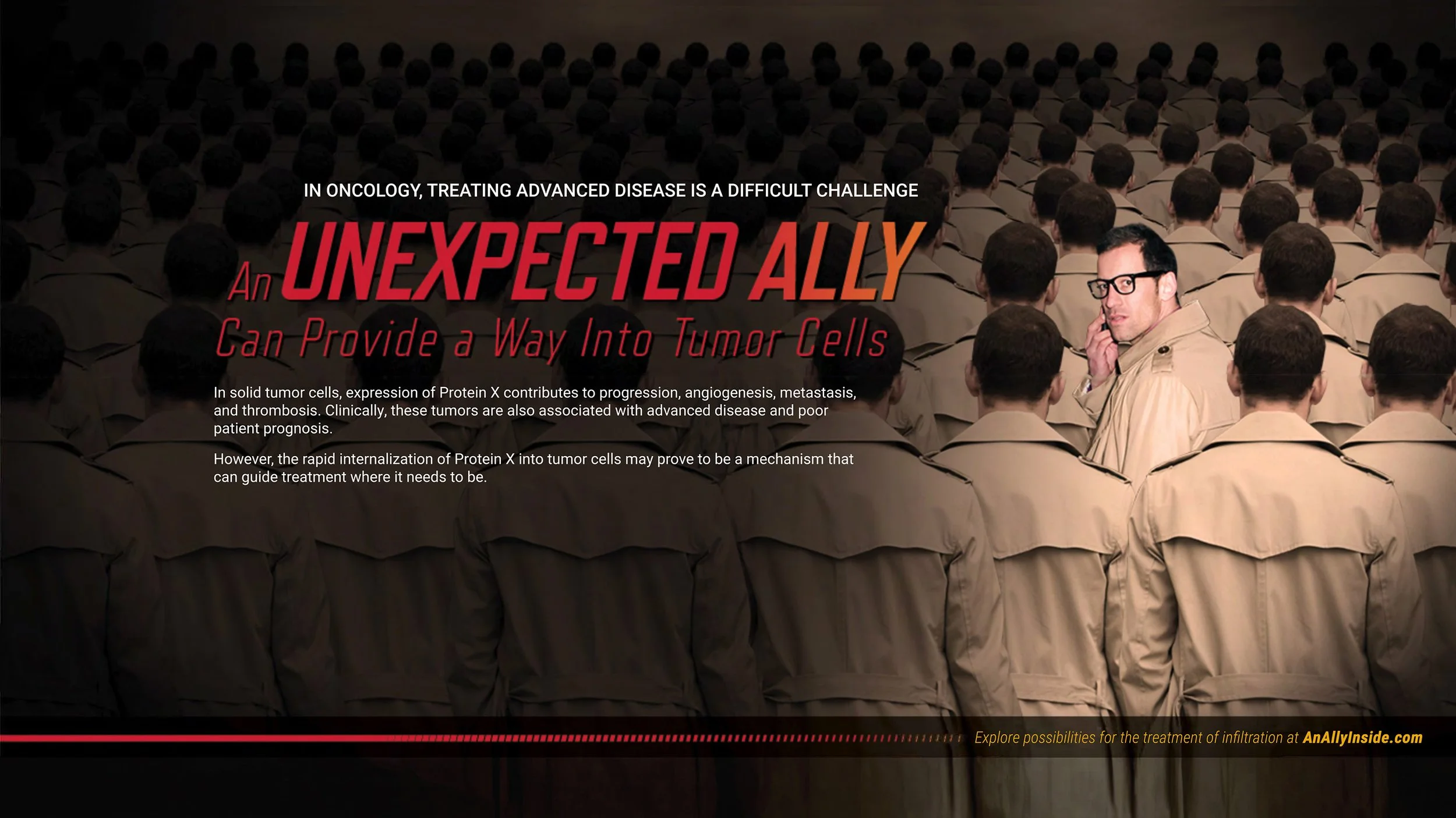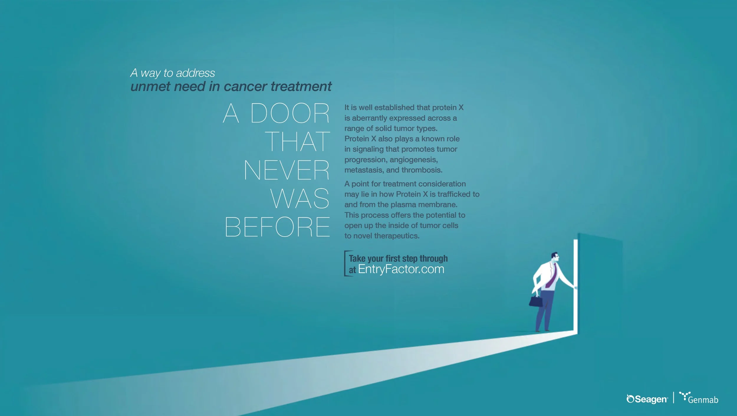 This first set was created for a medium-sized biopharma as part of a creative and strategic exploration for an unbranded, HCP-facing oncology campaign. Specifically, the campaign would support the launch of a new antibody-drug conjugate (ADC) with a novel molecular target. Market research indicated the idea of a novel target being expressed over multiple types of cancer was the part of the story most likely to drive our audience to learn more about the ADC. This aligned with a long-term plan to seek approvals for the ADC across those tumor types. Therefore, my art partner and I focused each of the ad lobs on Protein X as a treatment target instead of the ADC being for a specific type of cancer.