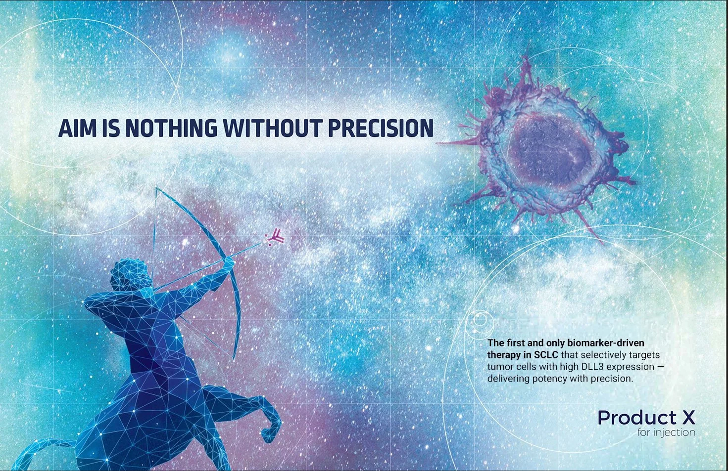 This second set was created for the pre-launch marketing of a treatment that would open a whole new paradigm in how to attack cancer. Specifically, a new biomarker (DLL3) was found to be expressed on specific cells (called “cancer stem cells”) that form and support malignant tumors. By targeting this biomarker, the treatment would be fighting not only cancer, but also the basis for its continued survival and growth. My art partner and I wanted to make sure this unique opportunity, in a space where treatment options are scarce (small cell lung cancer), came across with eye-catching visuals and headlines.